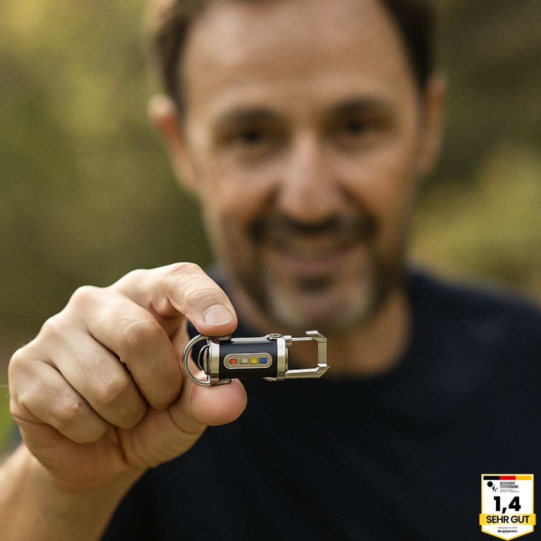 Der stabile Karabinerhaken sorgt dafür, dass die Lampe immer dabei ist – am Rucksack, Schlüsselbund oder Gürtel.